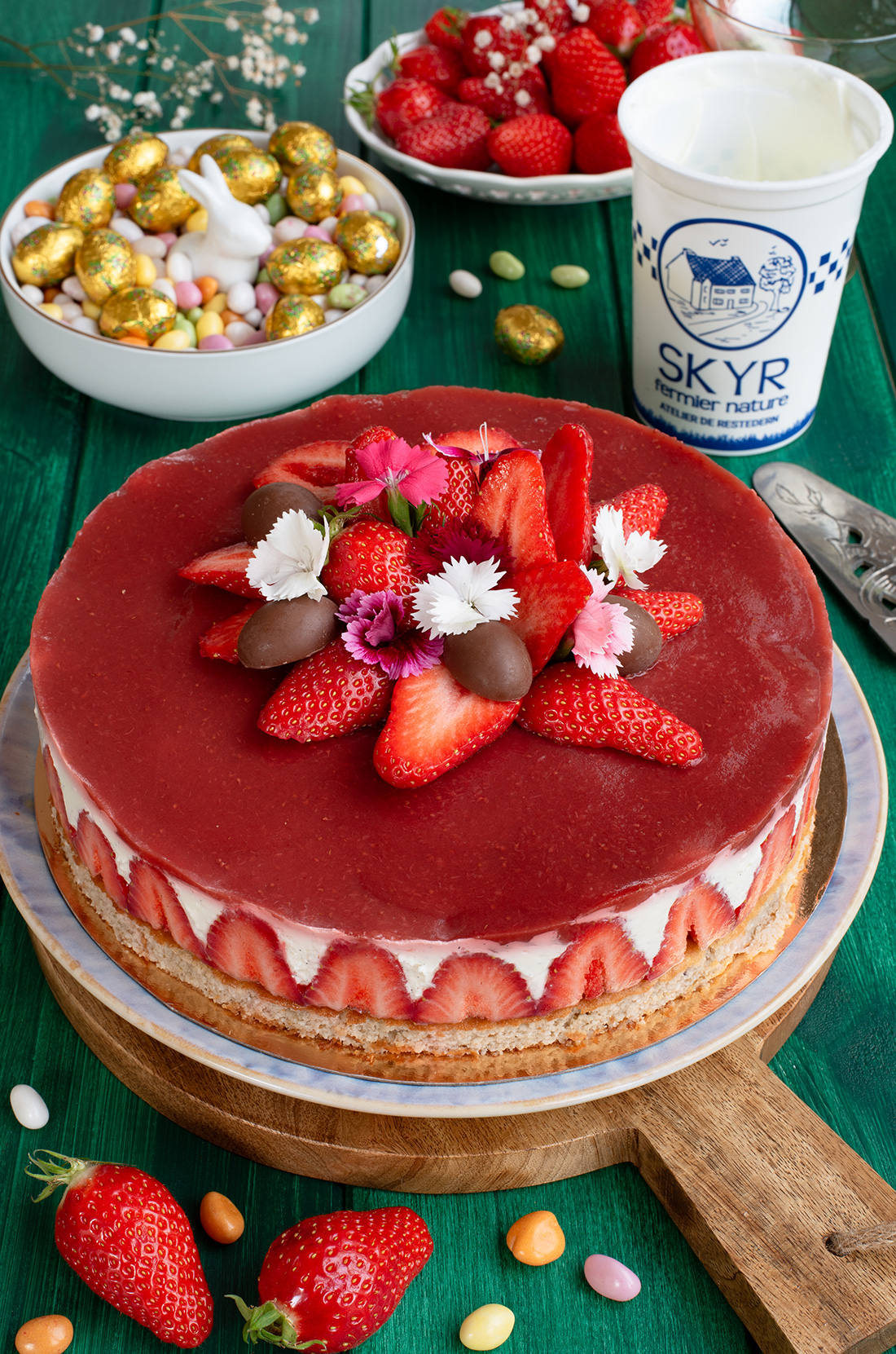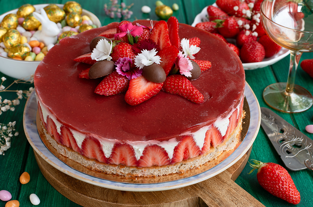 - Décorez avec quelques fraises coupées en morceaux, des fleurs comestibles et des demi-œufs en chocolat.