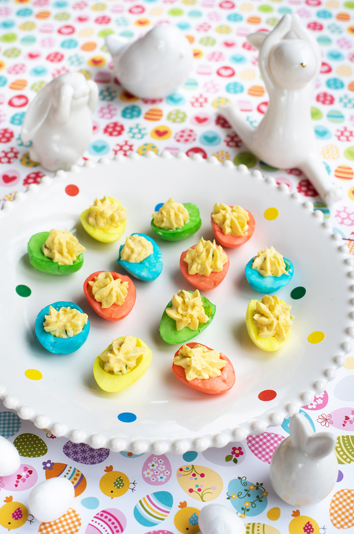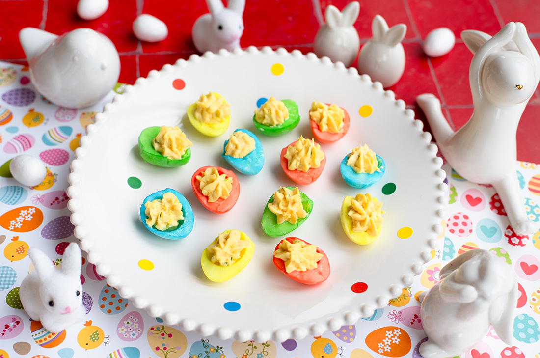 Ça change des oeufs de Pâques sucrés et c’est bien mieux qu’une poignée de chips ou autres biscuits trop salés. Mes oeufs ont une couleur très criarde mais en ajoutant très peu de colorant alimentaire dans l’eau de trempage, ils seront plus clairs, voire pastels.