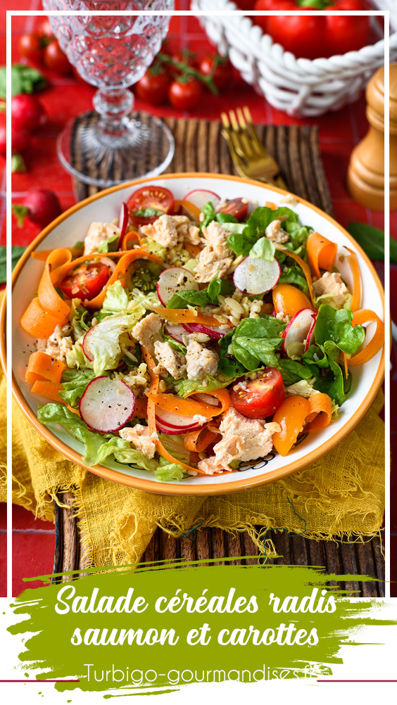 J’ai accordé ces céréales gourmandes, qui se cuisent en quelques minutes, avec des lanières de carottes et des rondelles de radis que j’ai plongé dans un bain d’eau glacée pour qu’elles soient bien croquantes. Un peu de saumon en boite auquel vous pouvez préférer une version fumée, divers légumes à piocher au gré de ce qui se trouve dans votre frigo et on obtient une salade délicieuse sans se prendre la tête ! Parfaite pour les vacances 😉