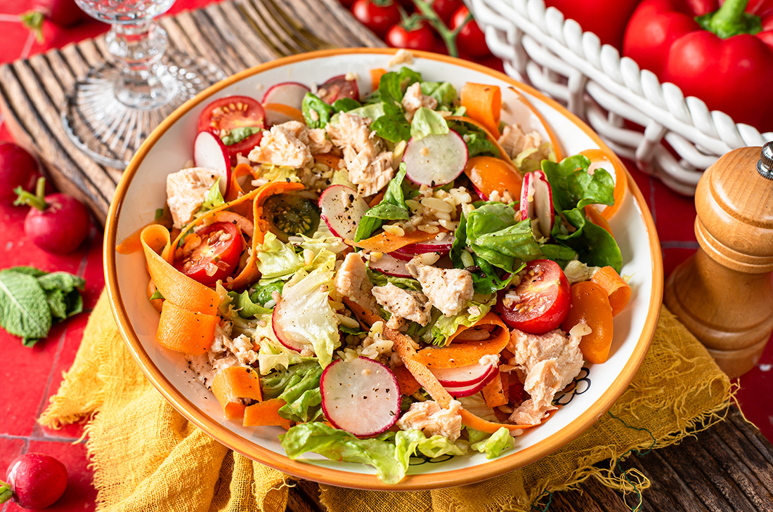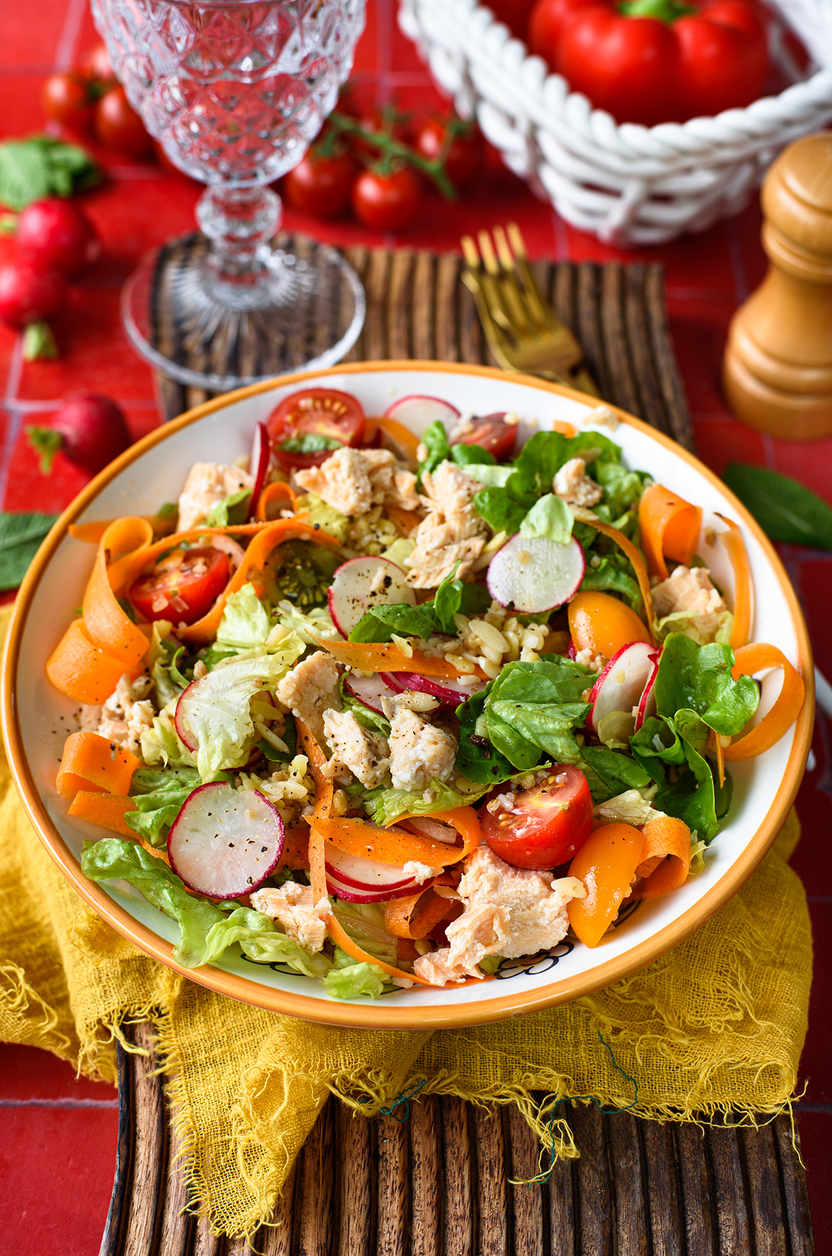 Une recette de salade de céréales au saumon garnie de crudités, une salade facile à réaliser et très savoureuse.
